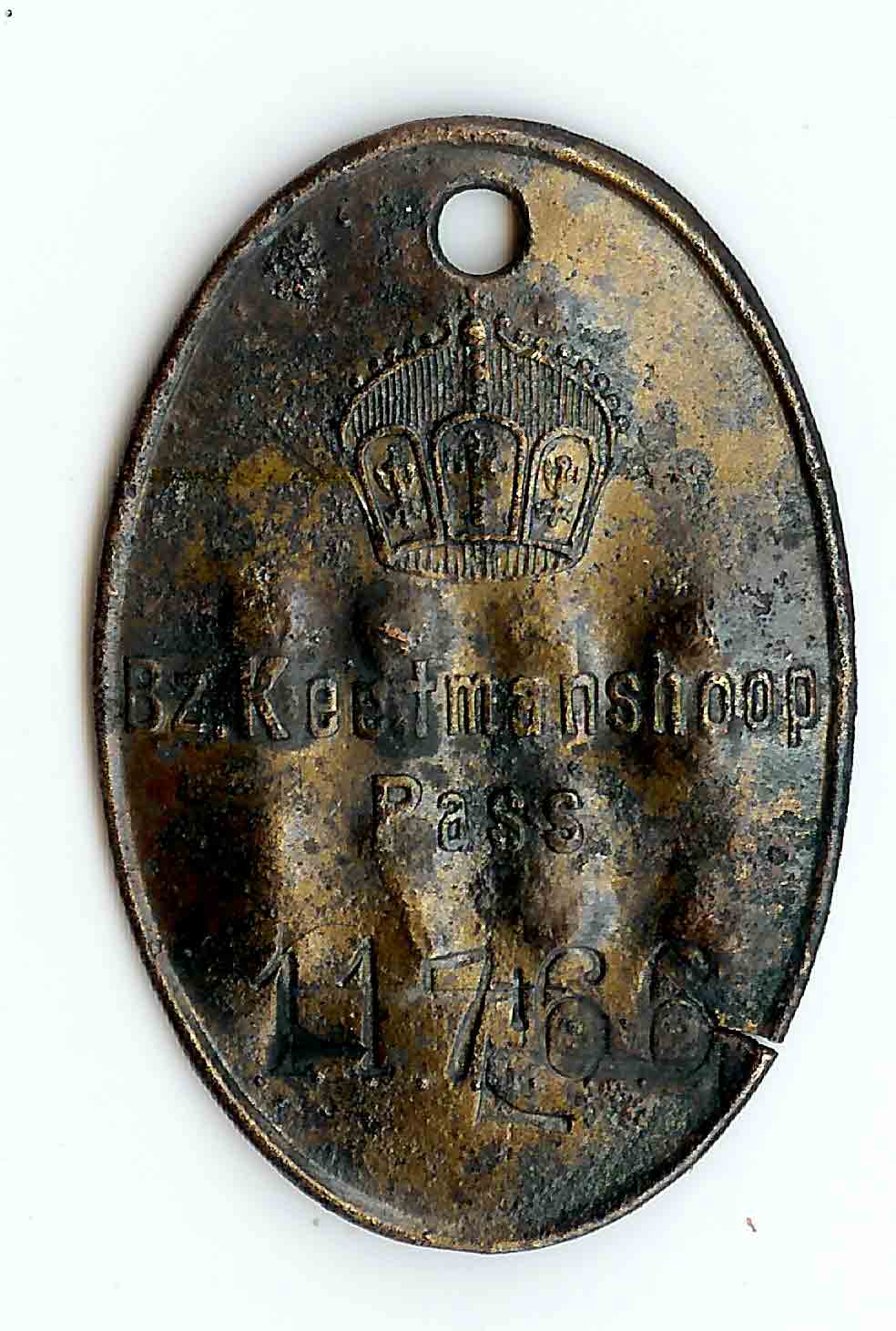 Hier eine weitere Marke von Keetmanshoop, bei der die alte dt. Nummer mit quergelegten Stahlnägeln ungültig gestanzt wurde.