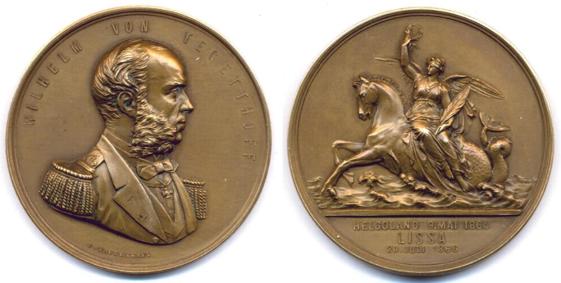 Die Seeschlacht von Lissa (in der Adria) fand statt während des dritten italienischen Unabhängigkeitskrieges (Risorgimento) zwischen der italienischen und der österreichischen Flotte unter von Tegetthoff. Sie wurde zu einem großen Erfolg für von Tegetthoff gegen die viel größere italienische Flotte, weil er seine Schiffe viel effektiver und tapferer einsetzte als sein Gegner. Er benutzte die Technik des Rammens und hatte einige seiner Schiffe provisorisch mit Stahlplatten als 'Panzerschiffe' ausgerüstet. Dies war die letzte Seeschlacht, in der die Rammtechnik benutzt wurde und die erste mit Panzerschiffen. Aber genauso wie die oben geschilderte Seeschlacht spielte sie für den Ausgang des Krieges keine Rolle. Weil Preußen - im Krieg gegen den Deutschen Bund unter Führung von Österreich - Österreich bei Königgrätz besiegt hatte, endete dieser Krieg mit dem Sieg Preußens über den Deutschen Bund, und Italien wurde geeinigt. Die Medaille ist in dem etwas schwülstigen Stil geschnitten, wie er im 19. Jahrhundert üblich war. Die Rückseite zeigt Viktoria mit Kranz und Palmzweig auf einem Seepferd nach links reitend.