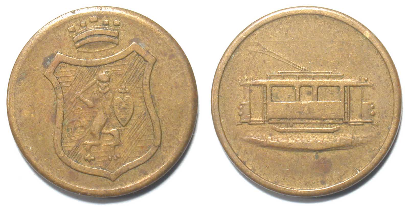 Eine Referenz gefällig? Es dürfte sich um #240EA aus "Smith, K. u. K., Catalogue of World Horsecar, Horseomnibus, Streetcar and Bus Tokens, except North America (1990)" handeln ("City Arms / Streetcar going right").