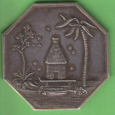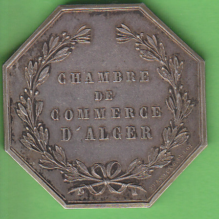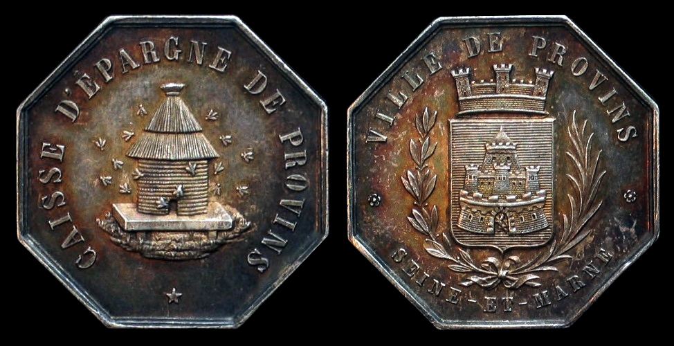 Jeton octogonal ND, ohne Signatur, Av. Bekröntes Stadtwappen (Burgturm, im Tor ein Löwe) im Blattkranz, Legende: Ville de Provins - Seine et Marne. Rv. Bienenkorb, darunter Stern. Legende: Caisse d’épargne de Provins. Rand: Punze Argent u. Biene.