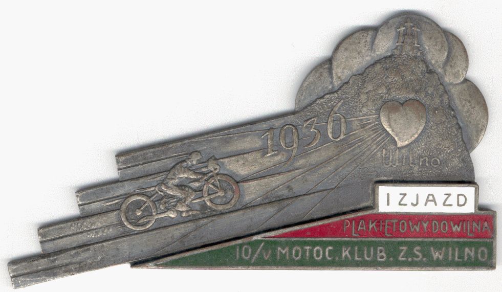 Diese Plakette von 1936 (100x53mm) stammt vom Motorradclub aus Wilna/Vilnius/Wilno (Motocyklowy Klub Z.S. Wilno). Die Sprache ist polnisch und nicht litauisch. (Plakieta) „Zjazd plakietowy do“ ist ein gängiger Ausdruck auf Clubplakettenfahrten. Die Übersetzung ist mir nicht ganz klar: Ausfahrt nach, Wettbewerbsfahrt nach, Rennen nach... Wer hat hier gute Polnischkenntnisse?