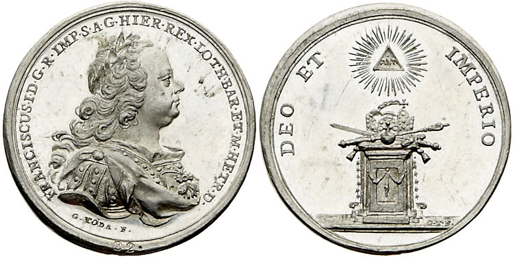 Medaille ohne Jahr auf die Krönung Franz I. 1745 zum römisch deutschen Kaiser in Frankfurt von Giuseppe Antonio Toda, unter dem Brustbild im Rand gut erkennbar die Zahl