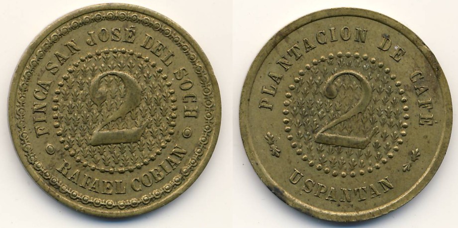 Der erste kommt von der Compania Hamburguesa de Plantaciones en Guatemala für die Plantage "Osuna Rochela" in San Andres-Osuna. Rulau gibt die Wertzahl 2 als zwei Reales an. Es gab auch Token ohne Wertzahl für den Tageslohn, Mais, Feuerholz und für den Vorarbeiter an. Es scheinen klassische Truck-Token gewesen zu sein.