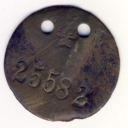 Diese interessante Gefangenenmarke wird im Moment auf einer südafrikanischen Plattform angeboten. Nach G. McGregor u. der uns bekannten Aktenlage kann es diese Marke mit der Nummer 25582 eigentlich nicht geben, denn die höchste Nummer für Messingmarken war 23000. Die techn. Daten entsprechen den üblichen Angaben: Messing; 45 mm Durchmesser; 12,1 Gramm.