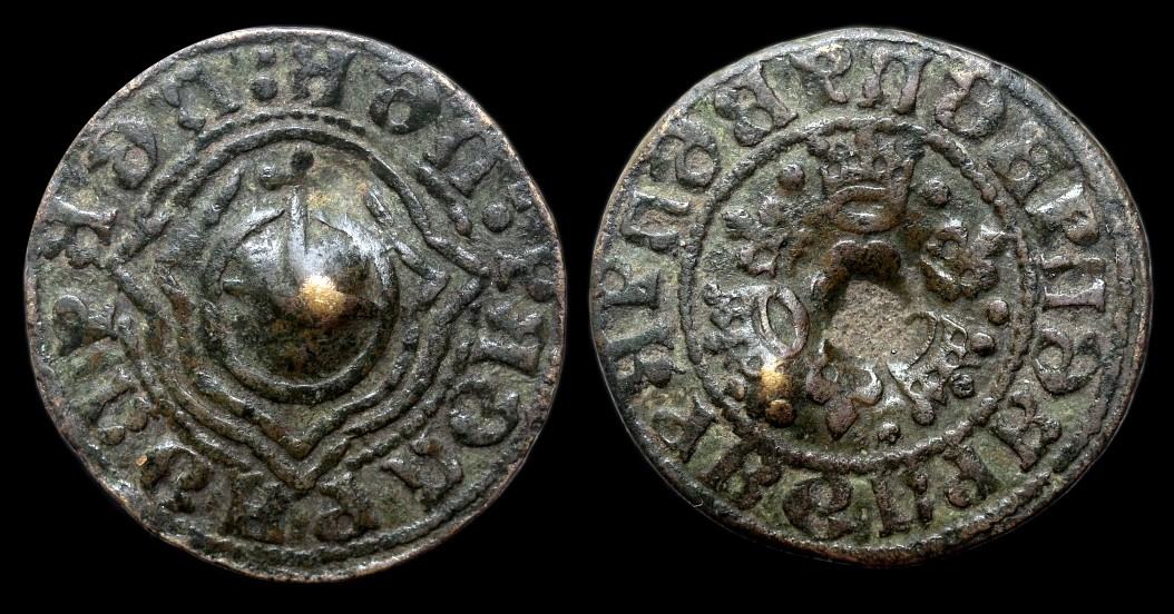 Was mir als Liebhaber mittelalterlichen Gepräges sofort aufgefallen ist, die Umschrift auf meinem Stück zeigt eindeutig Buchstaben aus der Gotik und dürfte demnach um gut hundert Jahre früher einzuordnen sein? Die Umschrift (wahrscheinlich Trugschrift?) ergibt allerdings keinen Sinn und das gotische "E" steht auf der Dreipaßseite auch zweimal seitenverkehrt. Hat Krauwinckel hier von einem älteren bereits vorhandenen Design abgekupfert?