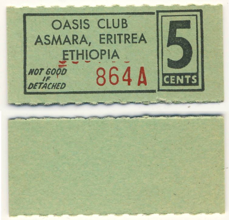 The Oasis Club was definitely the place to hang out! It was well managed, the Army having "Special-Services" personnel back then ... Directly inside was the cashier’s window where one bought "chit-books." ... These "chit-books" had coupons ranging from five-cents to five-dollars I believe. I learned that the Eritrean waiters were not allowed to handle American-money. Black-market I presume.