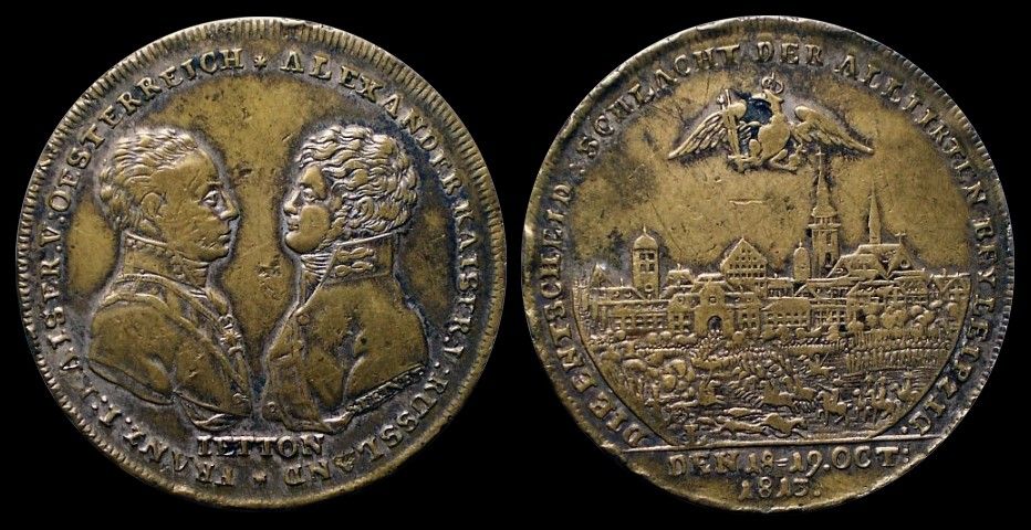 Messingjeton mit Restversilberung 1813 (von Stettner) auf die Völkerschlacht bei Leipzig. Die Brustbilder Franz I. und Alexanders gegeneinander. Rv. Preußischer Adler über Schlachtszene vor der Stadt. 33 mm. Br. 1259. Trésor Tf. 57.11. Slg. Jul. 2673.Napoléon selbst notiert im "