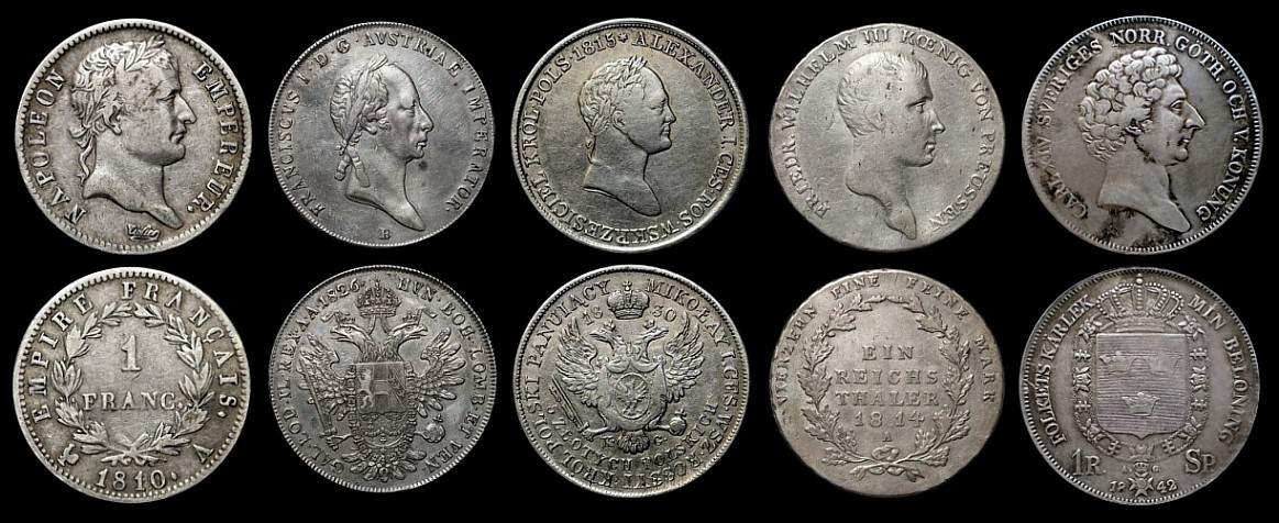 Diesen bescheiden wirkenden Stücken füge ich zur Illustration die Souveräne, deren Armeen sich bei Leipzig gegenüberstanden, im Münzbild an.
