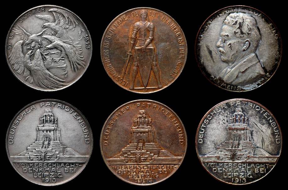 In den folgenden hundert Jahren wurde die Völkerschlacht in Deutschland unter nationalem Aspekt nach und nach episch überhöht. Ihren Höhepunkt erreichte diese Entwicklung am Vorabend des 1. Weltkriegs, als dank der Gründung und Initiative eines Patriotenbundes anläßlich der Jahrhundertfeier der Schlacht 1913 das monumentale Völkerschlacht-Denkmal bei Leipzig fertiggestellt wurde. Offiziell wurden zwei Gedenkmünzen verausgabt, die ich ihrer Häufigkeit wegen als bekannt voraussetze -