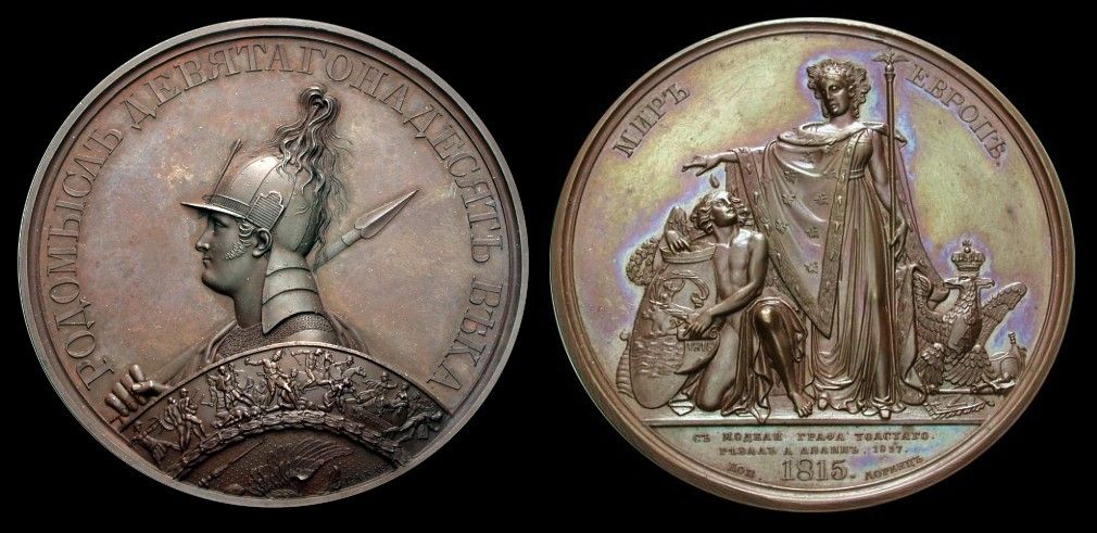 Alle drei Medaillen zeigen im Revers das Denkmal. Seine Gestaltung wird sehr kontrovers diskutiert. Das linke Avers zeigt als Allegorie einen Kampf von vier Adlern - die vier Wappenadler von Frankreich, Russland, Österreich und Preußen. Der schwedische Wappenlöwe ließ sich da wohl schlecht integrieren. Rechts ist der Architekt