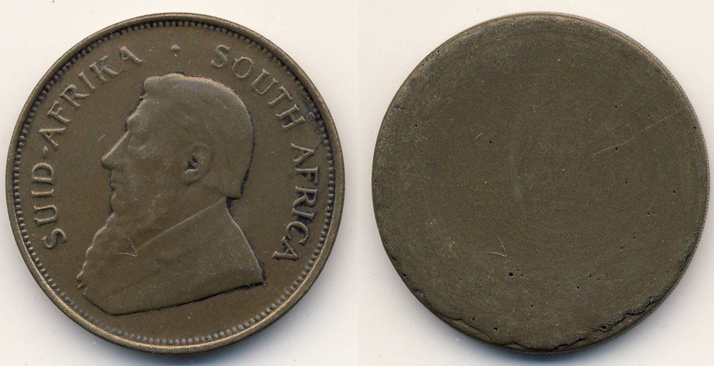 Das einseitige Teil ist auf der Vorderseite die Nachempfindung eines Krügerrands, dessen Durchmesser es auch erreicht. Das Material ist vom Gewicht her Aluminium oder eher etwas noch leichteres. Es scheint nicht galvanisch verkupfert worden zu sein, sondern es scheint sich um eine kupferfarbene Aluminium- oder Sonstwas-Legierung zu handeln.