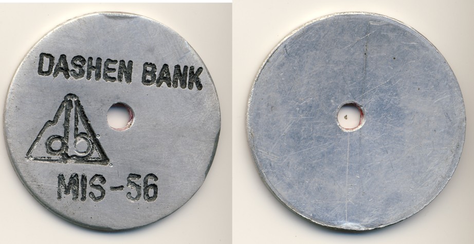 Anfangen möchte ich mit einem Token der Dashen Bank. Der Token ist mit "MIS - 56" bezeichnet. "MIS" scheint für irgendeine Sache zu stehen, die man in einer Bank halt so macht. Die "56" ist vermutlich die Nummer des armen Warteschlangenstehers vor diesem "MIS"-Schalter. Eventuell steht "MIS" für "miscellanous".