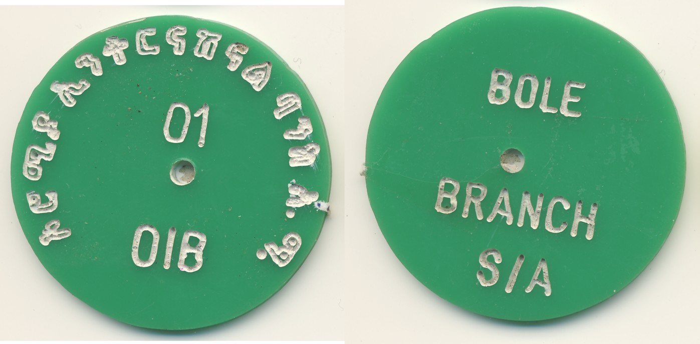 Ethiopia Token h Oromia Int Bank S-A 01 rund türkis Bole Branch.jpg