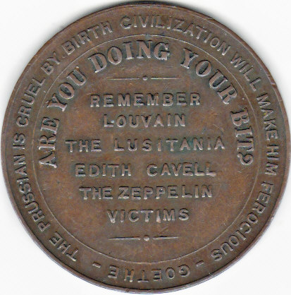 https://www.numisbids.com/n.php?p=lot&sid=1107&lot=466Der englische Kopist hat die Furie etwas züchtiger, aber doch gut kopiert und darunter die Stadtsilhouette von Paris sowie die Worte Paris 1914 eingefügt. Der Hintergrund war, daß die Einnahme von Paris 1914 wohl auch infolge von Fehlentscheidungen des Kommandeurs nicht gelungen war. Auf der Rückseite sind im Feld einige Kriegsgräuel, für die man die Deutschen verantwortlich machte, aufgezählt: Die Zerstörung der Stadt Löwen im August 1914, die Versenkung der Lusitania vom 7.5.1915, die Hinrichtung von Edith Cavell am 12.10.1915 und die Zeppelin-Opfer. (Der zeitliche Schwerpunkt der Luftangriffe lag im Frühjahr 1916, insgesamt waren 1.400 Todesopfer zu beklagen.) Die Aufzählung ist halbrund umgeben von der Frage: Are you doing your bit?, also etwa: Trägst du einen Teil (zum Kampf gegen die Deutschen) bei?