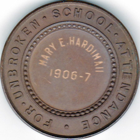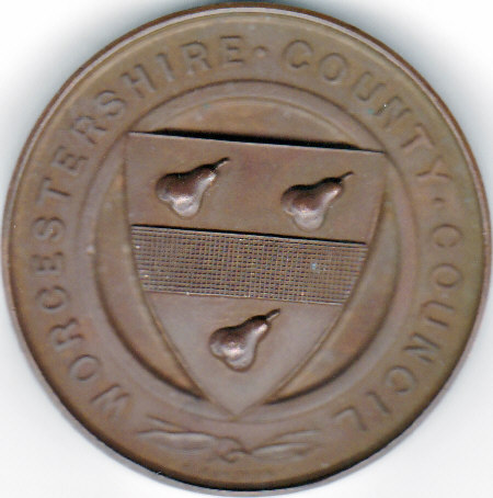 Die folgende Medaille ist vom Worcestershire County Council als Prämienmedaille "for unbroken school attendance", also für ununterbrochenen Schulbesuch im Schuljahr 1906/07 einer Mary E. Hardiman verliehen worden. - 31,6 g. 38 mm - Hersteller ist die Fa. Elkington aus Birmingham, die auch das Besteck für die Titanic lieferte. Gereizt hat mich das preiswerte Stück wegen des damaligen Wappens der Grafschaft, das mit hohem Relief ausgeprägt ist. Es zeigt drei schwarze Birnen geteilt 2:1 durch einen schwarzen Balken in silbernem Feld. Etwas ungewöhnlich in der Heraldik ist, daß es sich hier nicht schlicht um Birnen handelt, sondern daß die Form einer konkreten Sorte nachgebildet ist, der Worcester Black Pear. Diese Sorte soll schon von den Römern stammen und ist im Mittelalter in etlichen Zisterzienserklöstern der Region nachgewiesen. Die Birne ist sehr dunkel gefärbt und schwer (bis zu 260 g das Stück). Sie wird erst im Spätherbst geerntet und ist selbst da noch nicht ausgereift, dafür aber sehr lagerfähig. Ob sie gut schmeckt, weiß ich nicht. Jedenfalls ist sie nur gekocht genießbar und spielte früher eine größere Rolle in der Verpflegung von Militärs und Schiffsbesatzungen. Deshalb kam die Birne auch zur Würdigung im Wappen der Grafschaft Worcester. Ein Gericht, das aus der Birne zubereitet wurde, das "Warden pie" ist bei Shakespeare genannt: "I must have Saffron to colour the Warden Pies" heißt es im Wintermärchen IV, 3. Ob Safran die dunkle Birnenfarbe wirklich überdeckt? - Wer sich jetzt so einen historischen Birnbaum zulegen will, wird hier bedient und erhält einen Anblick der Birne: