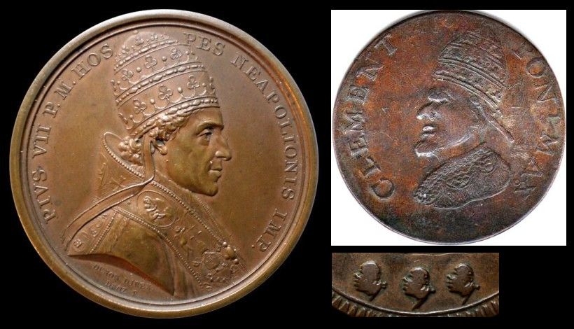 Das karikierte Papstportrait mit der markanten Nase kommt dem originalen Pius VII. recht nah. Die drei Köpfe im Wappen unten links auf dem Token finden sich in anderer Anordnung ebenfalls in seinem Wappen wieder, dort allerdings anders gestaffelt. Möglicherweise sind die von dir genannten anderen Kandidaten ebenfalls in verfremdeten Wappen dargestellt, dann bliebe nur noch das vierte Wappen offen?