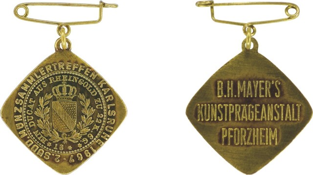 A) frühestes Abzeichen des 1967 durchgeführten 2. Süddeutschen Münzsammlertreffens in Karlsruhe (auch erwähnt in Kirchheimer, 1972)