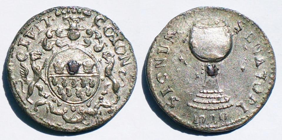 Av. Unter geziertem Helm mit Decke ovaler, fast kreisrunder Stadtschild von 8 ½ mm Höhe in wenig verzierter Einfas-sung. Die Kronen sind schlank und oben ausgebogen, die Teilung des Schildes wird durch zwei leicht nach unten ge-bogene Linien bewirkt. An den Seiten sind die gewöhnlichen Schildhalter, beide In der Richtung nach dem Schild blickend; sie stehen auf einem in der Mitte geraden, unten nach dem Rand hin ausgebogenen, an den Seiten nach oben geschweiften Gestellt. Vom Schildfuß her läuft unter dem Bogen des Fußgestells eine Verzierung aus zwei Ranken, die ungefähr wie ein A aussieht. Der Löwe ist doppeltgeschweift. Außen Kerbkreis; oben herum: CIVIT´ = COLON´ (kleine Buchstaben). Rv. Ein Rheinweinglas, sogen Römer mit hoher Säule, auf einem Fuß mit drei einfachen Zierreifen. Beim Übergang der Säule in den Kelch ist ein Kopf und beiderseits Zierat. Der Kelch selbst ist bauchig mir verengter Öffnung. Unten mit kleinen Ziffern bogig: 1730. Außen Kerbrand; rechts anfangend: SIGNUM´ = SENATORI´ Bem. Randschrift: BIBITE Zierat CUM Zierat LAETITA Zierat. In der Mitte ist ein Kupferstift von 2 mm eingelassen. Der doppelschwänzige Löse war um 1730 der übliche. Das SENATORI ist nicht etwa der Dativ, sondern die Abkürzung vom Senatorium. Katalog Noss 617 1728 gab es Schwierigkeiten wegen der Ratszeichen, von welchen, wie auch schon in früheren Jahren, viele Fälschungen gemacht und in den Verkehr gebracht wurden. Da sie, allerdings gegen ihrer Bestimmung, als Geld umliefen und wegen des Anspruchs auf Wein gern genommen wurden, ließ sich die vorhandene Menge schwer kontrollieren und Schäden für die Allgemeinheit nicht vermeiden. Deshalb wurde erwogen, die Ratszeichen so zu gestalten, daß sie sich von Geldstücken merklich unterscheiden. Eine solche Form fand sich in dicken gegossenen Schrötlingen mit einem durch die Mitte getriebenen Kupferstift darin. In dieser Gestalt war einer Verwechslung mit Geldmünzen vorgebeugt und die Fälschung erschwert. Es wurde die Prägung solcher Stücke beschlossen und deren Ausgabe in Aussicht genommen, sobald eine genügende Anzahl fertig gestellt sein würde. Hand in Hand damit sollte die Einziehung der alten Ratszeichen gehen. 1734 wurden dem Münzmeister 20 der alten Zeichen von 1716 zu 1 Taler angerechnet. Die Ratszeichen wurden bei jeder Ratssitzung deren gewöhnlich wöchentlich zwei stattfanden, den Bürgermeistern, den Sekretären, Syndiken und den anwesenden Ratsherren als Anweisung auf die eine gewisse Menge Wein aus dem Ratskeller gegeben. Für die nicht erschienenen Herren wurden jedesmal die Zeichen in die sogenannte Depositenkasse geworfen und am Schluß des Jahres verteilt. Auch bei außergewöhnlichen Gelegenheiten, z.B. bei einer Papstwahl, bei Jubiläen, beim Besuch vornehmer Personen, bei der Bekanntmachung eines Friedensschlusses, wurden Ratszeichen ausgeteilt. Der Probst von St. Martin erhielt als der vom römischen Stuhl bestellte Conservator privilegiorum jährlich zwölf Ratszeichen. Bei der großen Fronleichnahmsprozession gab es für den Weihbischof sechs, für den Domprediger vier, für jeden der vier Äbte vier, für jeden der sechs Dechanten vier, für den ältesten Domherrn vier, für die acht Cholare zusammen vier, für die Sänger und Organisten zusammen zwölf, für den Offermann zwei, für die Führer der Soldaten zwei, für die Bürgermeisterfrauen vier, für den Kaplan der Kirche Jerualem vier, für die Frau des Umlaufs, welche den Traghimmel verzierte, zwei, für jeden der vier Spielleute zwei und für jeden in der Prozession gehenden Ratsherrn eins. Die Teichen, gegen welche im Ratskeller jederzeit Wein geschenk werden mußte, hatten einen Silberwert von 7 Albus, galten aber im Verkehr als 39. Wann das hier beschriebene Zeremoniell aufgekommen ist, wird nicht gesagt, wohl dürfte es 1672 schon so oder ähnlich in Kraft gewesen sein. Die Bewertung mit 7 Albus kann für diese Zeit zutreffen, wenn man annimmt, daß die Zeichen aus feinem Silber bestehen. Der Verkehrswert von 39 Albus stammt aber aus dem letzten Teil des 18. Jahrhunderts. Auch zu außergewöhnlichen Ehrungen wurden die Ratszeichen verwandt. So erhielt 1687 der Münzmeister Newers als Belohnung für die erfolgreiche Reise nach Düsseldorf 12 Zeichen. Dann wurden bei besonderen Gelegenheiten an die Mitglieder des Rates diese Zeichen verteilt, als Regel jedesmal wenn die Neuprägung von solchen nötig wurde; dann empfing jeder Berechtigte 3 Stück. Ferner wenn z.B. das Portriat des jeweils regierenden Kaisers in der Ratsstube aufgehängt wurde. Diese Feier trug 1754 5 Stück ein. Am Ende der städtischen Selbständigkeit, als kein eigenes Geld mehr geprägt wurde, benutzte man die Ratszeichen gar zur Zahlung von Honoraren oder Gehalt. Bei der jährlichen Hebammenprüfung erhielt der Gewaltschreiber 1793: 42 und 1797: 54 Ratszeichen, der unterrichtende Professor der Medizin aber für das Jahr nur 40, 1796 wurden dem Stadtmusikus für ein Konzert 13 Zeichen gespendet und als 6 ½ Taler berechnet. Auch ein Buchbinder wurde so entlohnt. Derartige Ausgaben fanden nach dem 1. Juli 1897 nicht mehr statt.