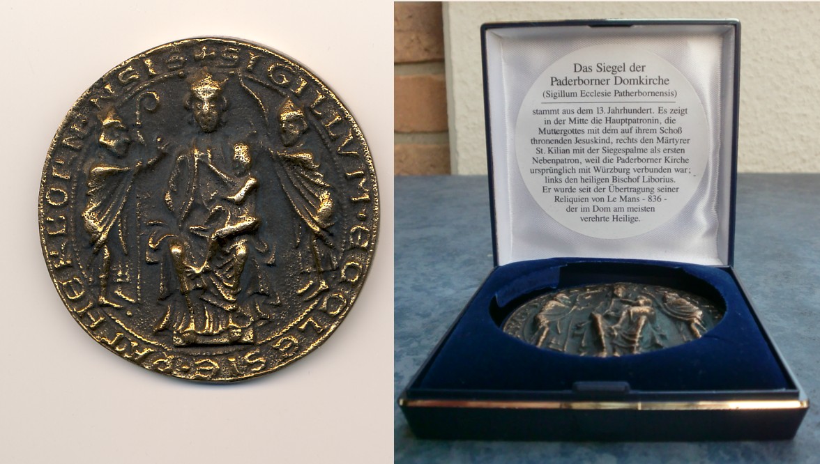 Darf ich mal wieder etwas aus Paderborn vorstellen? Wenn nein, kommt jeder Einwand zu spät. Wenn ja, bekommt Ihr hiermit eine Nachprägung des Paderborner Domsiegels zu sehen. Dieses wurde im 13. Jahrhundert in Form gebracht. Das Original besitze ich leider nicht, wohl aber eine Nachprägung aus Bronze. Diese wurde "Zur Erinnerung an die Verleihung der Robert-Schumann-Medaille an den Erzbischof von Paderborn Dr. Johannes Joachim Degenhardt in Montigny bei Metz am 13. Januar 1994" herausgegeben.