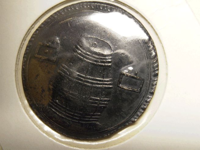 Dieser Token ist ebenfalls sehr interessant. Rückseite ein (Pinkel)fass, Vorderseite Urinzeichen 1697.