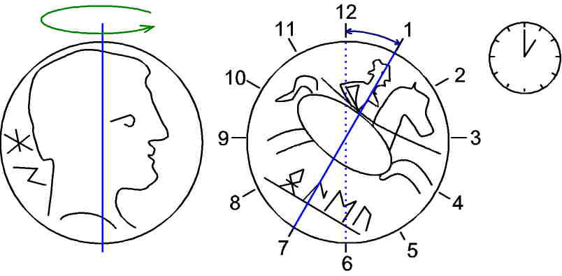 2) Man dreht die Münze um die nach oben zeigende Achse auf die Rückseite.