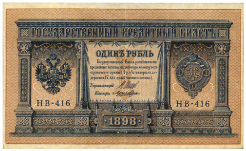 Dein Schein ist mitnichten aus der Zarenzeit, auch wenn 1898 darauf steht. Lt. Hühnerbla aus dem Banknotenforum wurden diese Scheine in den Revolutionswirren nachgedruckt, Deiner ab März 1917. Die originalen Scheine haben eine Kontrollnummer und nicht wie der abgebildetete eine Seriennummer.
