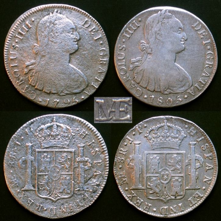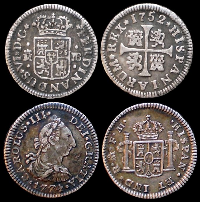 Es gibt eine ganz einfache Unterscheidung zwischen den spanischen Prägungen und denen aus den Kolonien - die Legende der Rückseite! Bei spanischen Münzen lautet sie HISPANIARUM REX, bei Kolonialmünzen HISAPAN(IARUM) ET IND(IARUM) REX.