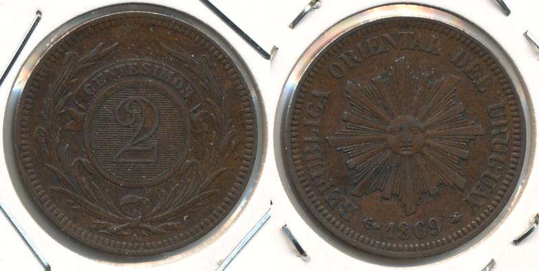 Uruguay, 2 Centesimos 1869, H=Heaton/Birmingham