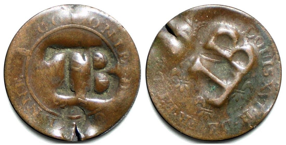 Das ist eine zeitgenössische Fälschung einer 2-Sous-Münze von Cayenne, die aus einem Black Dog (1 1/2 d) mit dem Gegenstempel TB einen Stampee (2 1/4 d) gemacht hat. Der echte Stampee ist auf den - mit einem gekrönten C gegengestempelten - üblichen Kolonialmünzen zu 2 Sous. Übrigens waren diese Münzen mit dem Stempel TBO erst seit dem 5. November 1798 per Gesetz kursgültig. Ihre Umlaufzeit war also noch wesentlich kürzer als angenommen. Im Anschluss noch zwei - vermutlich - echte Beispiele.
