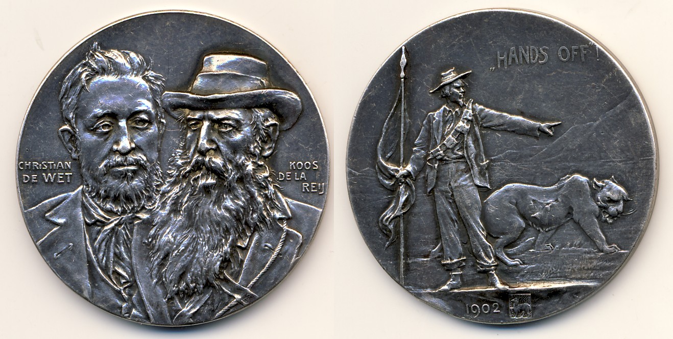 Diesmal geht es um Südafrika, genauer gesagt um den 2. Burenkrieg 1899 -1902. Damals standen sich burische und britische Truppen in Oranje und Transvaal gegenüber. Wie aus den Geschichtsbüchern zu entnehmen ist, mußten die Buren schließlich klein beigeben. Dem Ansehen von Christiaan Rudolf de Wet und Koos de la Rey, beides Generale der burischen Armee, tat das allerdings keinen Abbruch. Die beiden Helden sind auf der Vorderseite dieses Stückes aus Silber abgebildet. Schwerer ist die Interpretation der Rückseite. Wir sehen eine Person, die ein eingeschüchtertes Löwenweibchen mit den Worten “Hands Off“ davonschickt. Möglicherweise eine Metapher der Buren gegen die Engländer, die ja 3 Löwen in ihrem Wappen tragen. Oder auch ganz was anderes. Noch kryptischer ist für mich die Punze rechts von der Jahreszahl 1902.
