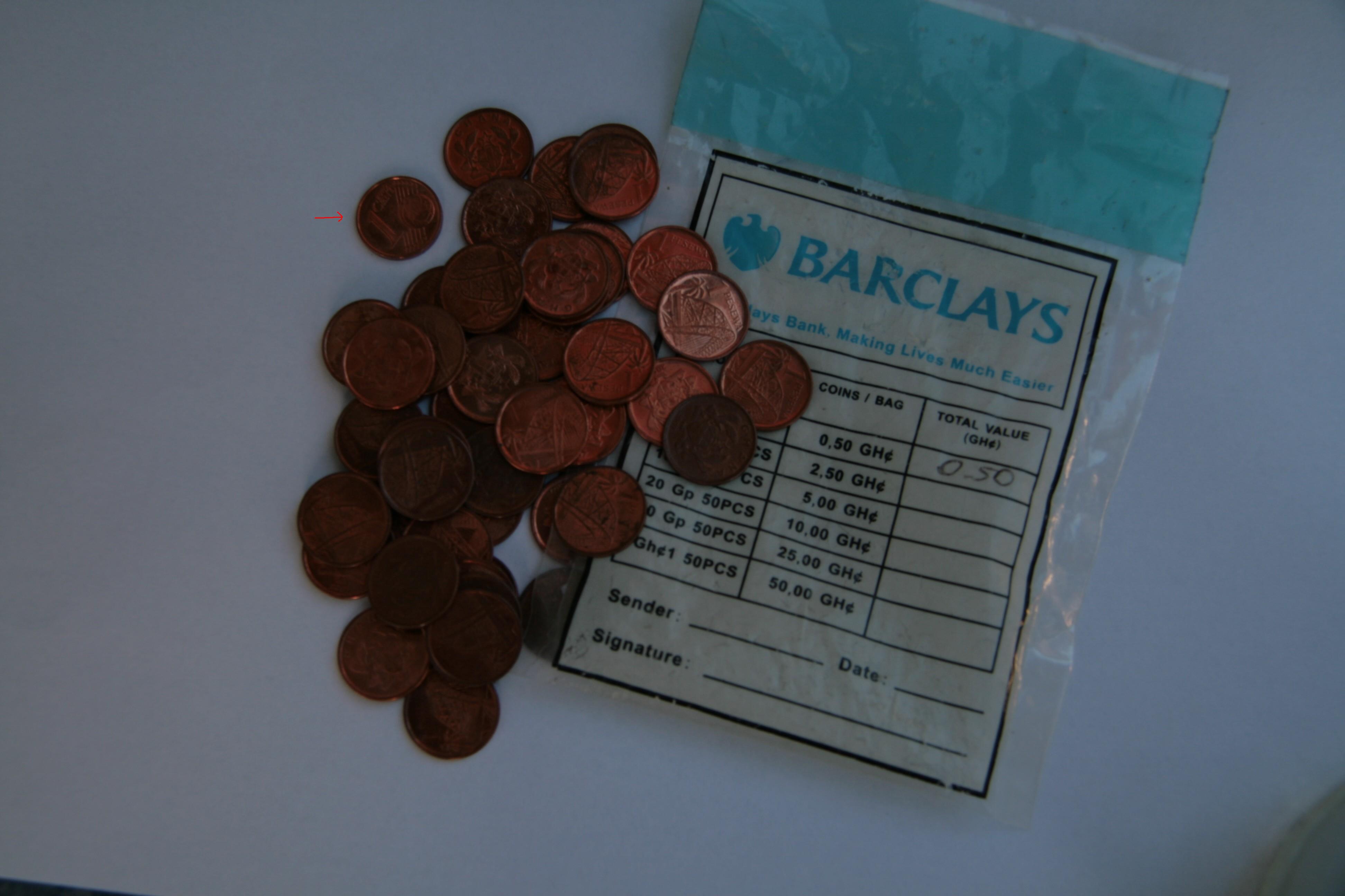 Darf ich einmal auf eine kleine Kuriosität aufmerksam machen? Bei meinem Besuch in Ghana über den Jahreswechsel 2013/2014 schaute ich immer wieder bei Filialen der verschiedensten ghanaischen Banken vorbei. Ohne Hoffnung, irgendwelche neuen Typen aktueller ghanaischer Münzen einzukassieren, ließ ich mir Tütchen von den kursgültigen Nominalen aushändigen. Nix war’s mit neuen Typen oder Jahrgängen (der einzige neue Jahrgangsfund - 5 Pesewas von 2012 - stammt aus dem Umlauf und nicht von der Bank). Dazu vielleicht irgendwann ein eigenes Posting.