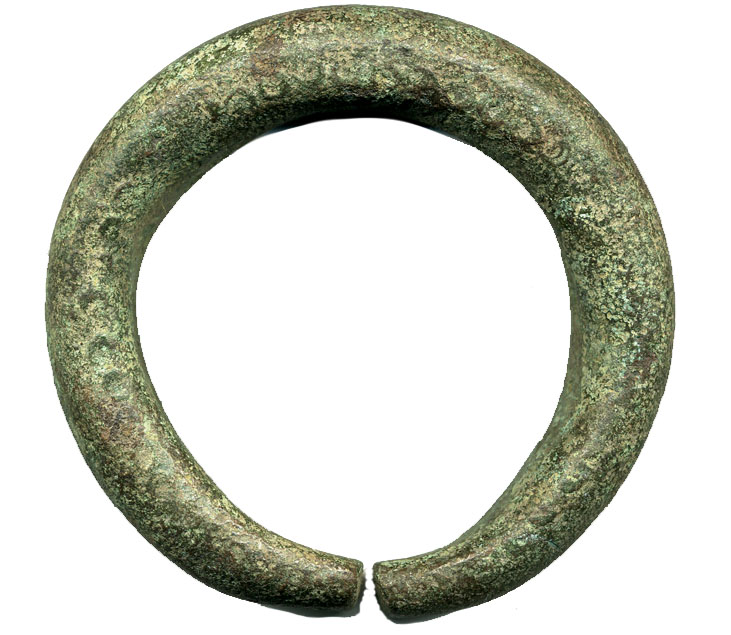 "255D.1 Spatulate-end bracelet. Ribbed body & raised design on ends." gefunden. Ein Bild meines Stücks - diesmal mit Aufsicht auf ein verziertes Ende - füge ich daher nochmals ein.