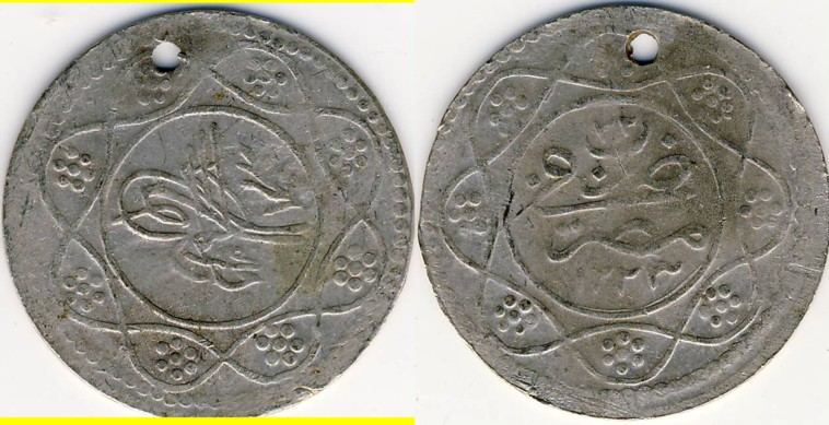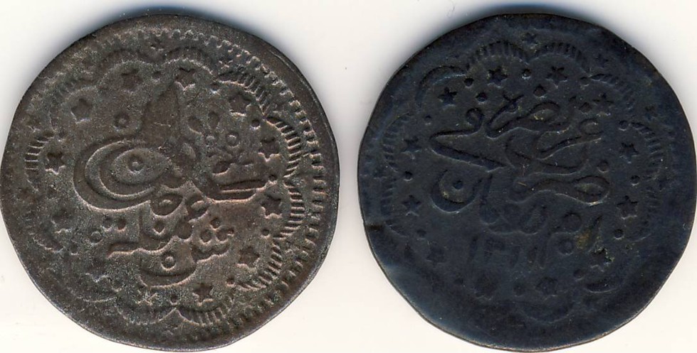 Während sich der halbe Piaster am ägyptischen 20-Para-Stück (S #19, KM #176) orientiert, hat der 5er sein Vorbild im sudanesischen 5-Piaster-Stück 1311/- (im Schön der 15. Auflage werden mehrere Typen als S #9 zusammengefasst, KM #19). Beim Scan unten habe ich aus Faulheit zwei typgleiche Münzen gleichzeitig gescannt.