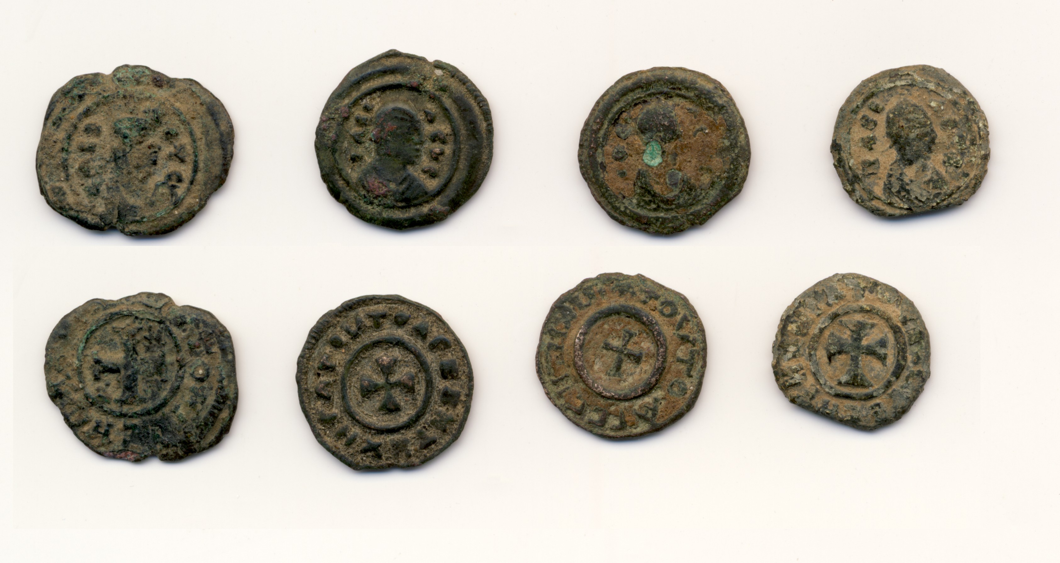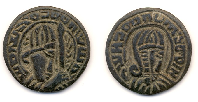 das hier in Rede stehende Stück (oberes Bild), über dem ich gerade brüte, ist wahrscheinlich irgendein neuzeitliches Fake. Aber wovon? Ich habe es aus Axum mitgebracht, aber eine axumitische Münze ist es nicht. Das Rv mit dem Kreuz erinnert zwar an die Katalognummer 76 im Munro-Hay, das Av ist aber anders gestaltet. Dieses Av-Motiv ist mir bei meinem Äthiopien-Aufenthalt mehrfach über den Weg gelaufen. Weiß jemand, ob es axumitische Siegel gegeben hat, aus welchem Material die waren und wie sie ausgesehen haben könnten?