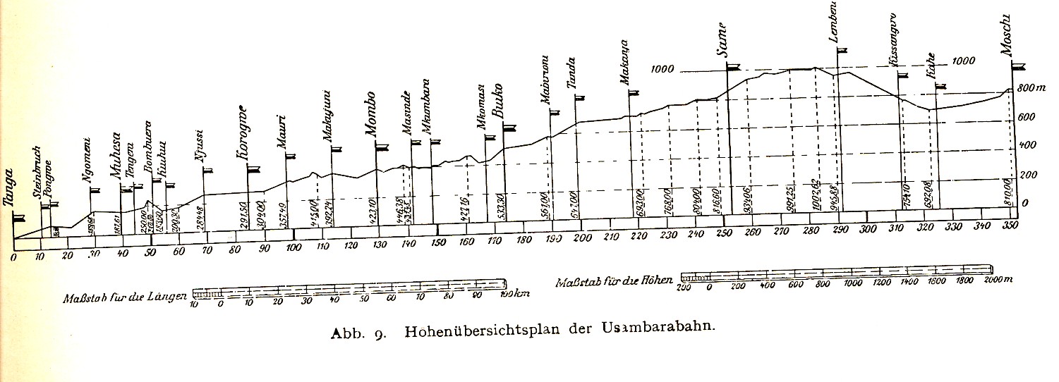 Ein Streckenprofil der meterspurigen Usambarabahn, entnommen aus dem vorzüglichen Buch von F. Baltzer "Die Kolonialbahnen", C.J. Göschen'sche Verlagshandlung, Leipzig 1916, hänge ich mal an: