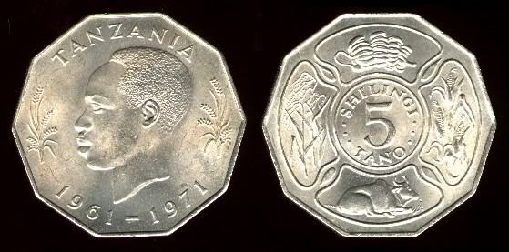 - Die ersten Kursmünzen Tansanias von 1966 bis in die 70er Jahre, darunter auch dieses Stück.