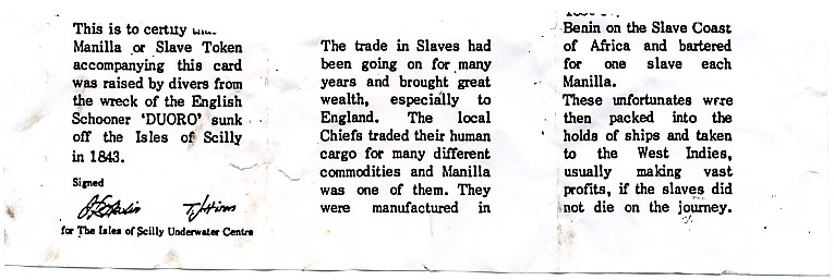 Der Verkäufer dieses Teils behauptet, dieses hier vorgestellte Stück sei 1843 mit dem Schoner “Duoro“ gesunken. Als Beweis für seine These legt er ein ausgerissenes “Zertifikat“ bei, das ich an dieser Stelle einfügen möchte.