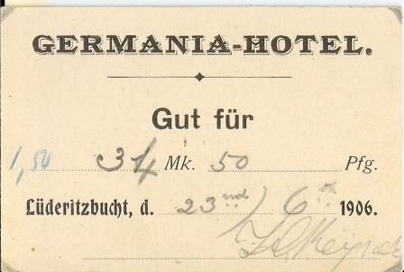 Heute kann ich wieder mal etwas ganz Besonderes vorstellen. Einen Gutschein im Wert von 34,50 Mark aus dem Hotel GERMANIA in Lüderitzbucht von 1906. Viele Etablissements verwendeten in DSWA diese Gutscheine. Am Ende der Reise bezahlte der Gast seine Zeche, die Gutscheine wurden dann vernichtet. Lediglich in Gerichtsakten,bei Klage gegen Zechpreller, blieben diese Gutscheine erhalten.