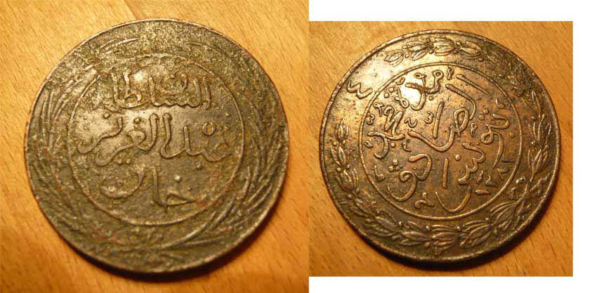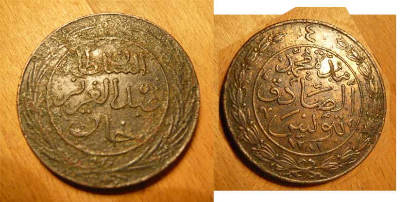 Das sind 4 Kharub aus dem Jahr AH 1281 aus Tunesien, geprägt wurde sie aber in der Heaton Mint in Birmingham.