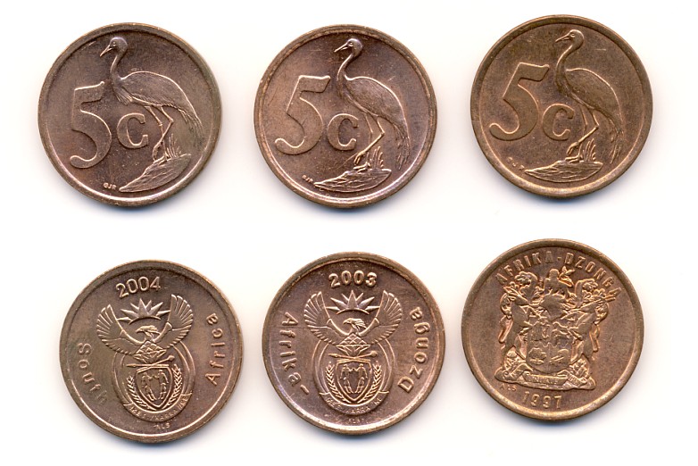 Die aktuellen 5ct-Münzen aus RSA sehen aus, wie im Anhang gezeigt. Wertseite mit dem Paradieskranich, Rückseite mit dem Staatswappen (rechts das alte bis 2000 gültige, mitte und links das neue). Es gibt auf der Wappenseite reichlich viel Varianten mit den verschiedensten Landesspachen in der Umschrift. Die drei gezeigten Exemplare verstehen sich nur als Beispiele. Diese Münzen scheiden als Basismünze für die Touristenprägungen allerdings aus, weil sie aus Kupfer-plattiertem Stahl bestehen, während mein Quetschie den Magneten nicht anzieht. Obwohl keine Queen und kein Nelson Mandela auf den Münzen abgebildet ist, wird Z-MANN's Kommentar