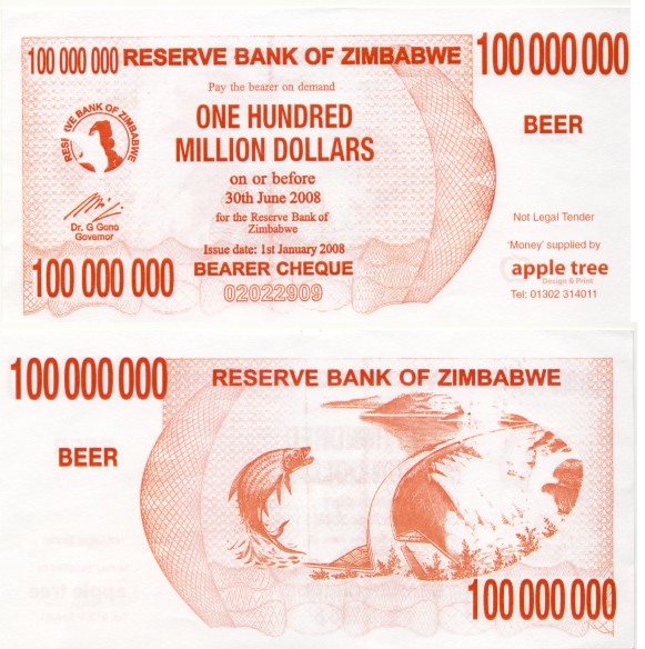 Vermutlich ein Fake, aber ich habe mal meine Kontakte zu ZIM spielen lassen, ob das Teil nicht vielleicht wirklich als Beer-Token Verwendung fand. Jedenfalls ist es ähnlich zum am gleichen Ausgabetag (30.06.08) in Umlauf gekommenen BC zu 10 000 000 ZIM-$ (Pick#55). Farbe und Design sind gleich, eben nur der 10-fach erhöhte Wert. Den originalen Bearer-Cheque zu diesem Nominal findet Ihr im Bild 2. Im Gegensatz zum Bier-Stück ist dort auch ein Wasserzeichen und ein Silberstreifen als Sicherungsmerkmal zu sehen. Außerdem ist das Papier von anderer Qualität. Deshalb ist die Bier-Note, die ich hier aus Jux vorstelle, sicherlich ein Fake. Der eigentliche Bearer-Cheque zu 100 000 000 ZIM-$ (Pick#58) kam übrigens erst ein halbes Jahr später heraus und hatte auch eine andere Farbe (Bild 3).