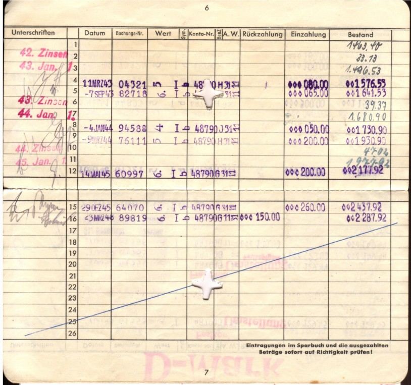 Der erste Auszug zeigt ein geregeltes Einkommen und Sparverhalten noch während der letzten Kriegsjahre und über die Kapitulation hinaus. Aus der Spareinlage läßt sich übrigens ein ungefähres Gehalt erschließen. Von 1945 bis 1948 dann eine Zäsur - keinerlei Kontenbewegung. Die Kontoinhaberin war zu dieser Zeit - entnazifiziert, obwohl nie in der Partei - als Dolmetscherin für die britische Verwaltung abgestellt. Es war die Zeit der Naturalienwirtschaft und Zigarettenwährung.