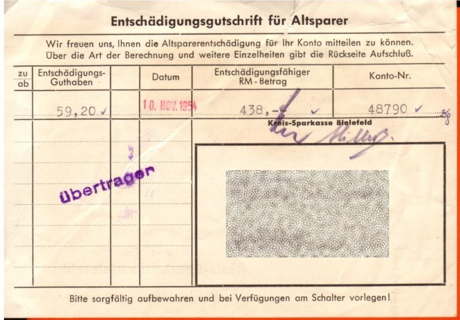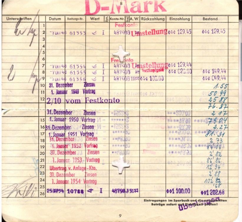 Der nächste Auszug zeigt die Umstellung auf die D-Mark - sehr deutlich der Verlust bei der Spareinlage (von dem besonders die Kleinsparer betroffen waren), dann der Eintrag zum Kopfgeld und die erhebliche Barentnahme ... und wieder keine Spareinlage über sechs volle Jahre! Erst 1954 scheint sich die Situation zum besseren verändert haben.