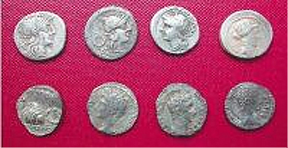 Photo: Diese acht, am Südhang des Teutoburger Waldes in Brackwede gefundenen Denare (Münzmeister- und Octavianus-Denare), könnten auf die frühere Existenz eines römischen Signalturmes aus der Zeit des Augustus hinweisen.