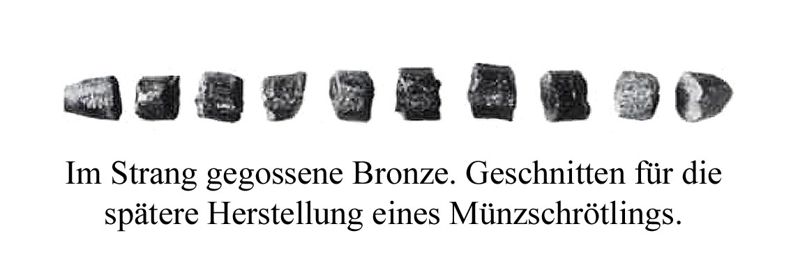 2. Die Barren wurden, wohl leicht erhitzt, von zwei Arbeitern in im Mittel 8 x 8 mm messende zylindrische Bronze-Stückchen zerlegt (siehe Abb. 2), dabei wurde der Barren mit einer längsgerieften Flachzange festgehalten und mit einer Beißzange wurden die einzelnen Stücke abgetrennt. Viele dieser Barrenstücke tragen außen deutlich die Zangenspuren und an den Trennungsflächen außer den Schnittspuren auch Bruchspuren.