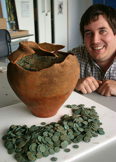 Der Münzhort, der nach Ansicht von Peter Reavill nicht nur außerordentlich umfangreich, sondern auch sehr wichtig ist, wurde ausgerechnet von einem Anfänger als Sondengänger entdeckt. Das ist wahrscheinlich einer der größten in Shropshire jemals entdeckten Schatzfunde. Der Finder, Mr. Nic. Davies, hatte seinen Metalldetektor erst einen Monat zuvor gekauft und dies war sein erster Fund überhaupt. Der Münzhort wurde in der Nähe eines Reitweges gefunden, auf einem Stück Land, auf dem er keine Sucherlaubnis besaß. Daher ist es wichtig, die Erlaubnis des Landbesitzers vor Beginn einer Suche einzuholen. Die Münzen befanden sich in einem sehr großen Vorratsgefäß, dass vor ungefähr 1700 Jahren dort vergraben wurde, wo sie seither darauf wartete von jemandem entdeckt zu werden.