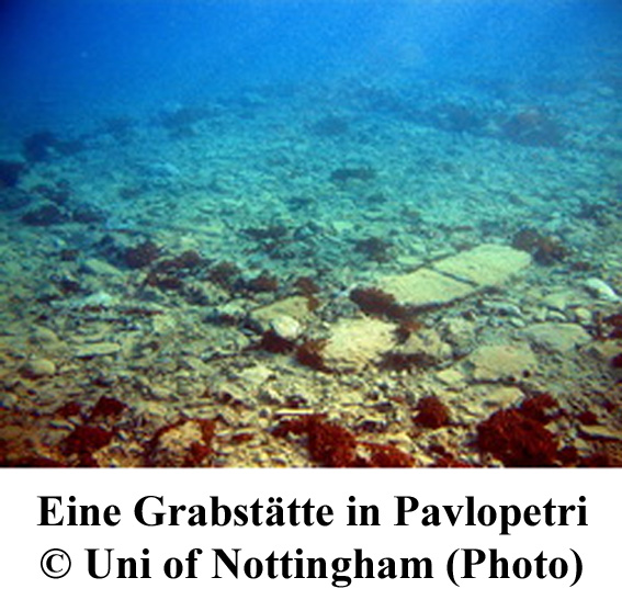 Die Ruinen von Pavlopetri, die in 3 – 4 m Wassertiefe vor der Küste von Laconia auf dem Peloponnes liegen, werden in die Zeit von 2800 v. Chr. datiert. Viele Gebäude, Straßen, Höfe und Grabstätten scheinen noch völlig intakt erhalten zu sein. Die Experten glauben, dass die gefundenen Unterwasserruinen aus der mykenische Periode (ca. 1680 – 1180 v. Chr.) stammen.