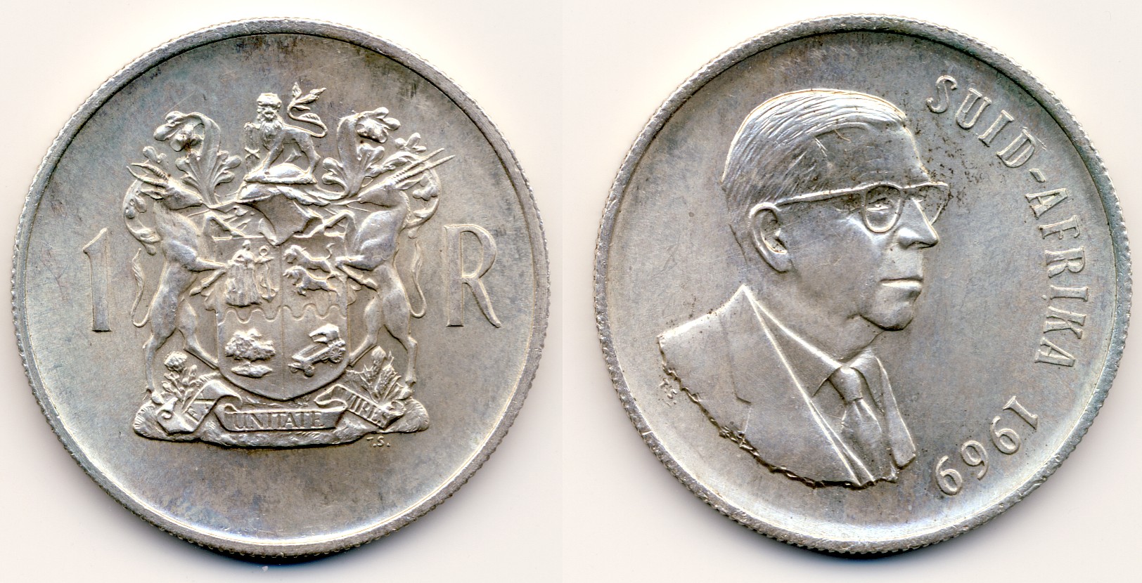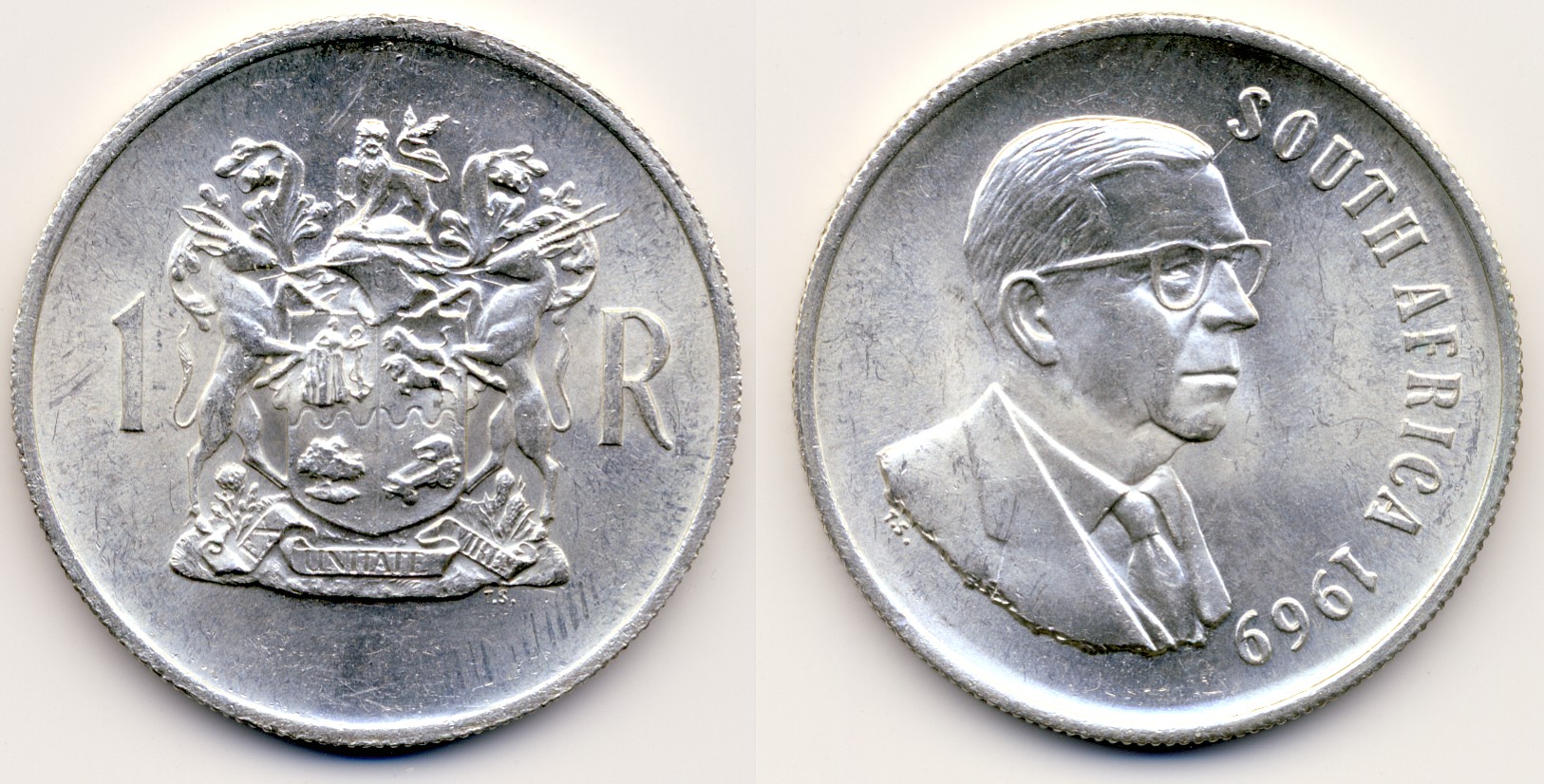 Warum noch 1969 Münzen mit dem längst begrabenen Dönges in Umlauf gebracht wurden, entzieht sich meiner Kenntnis. Vielleicht war man zu voreilig mit der Prägung, vielleicht bedeutet es aber auch eine gewisse Form von Respekt dem verhinderten Präsidenten gegenüber. Anno 1969 war jedenfalls Jacobus Johannes Fouché Präsident von Südafrika. Dazwischen gab es als Interimspräsident noch den betonköpfigen Rassisten Jozua François Naudé. Von diesem unangenehmen Kerl gibt es glücklicherweise keine Münzen. Aber Fouché hat es immerhin zu Kleinmünzen bis 50 Cents gebracht. Ein "Rand-Stück" blieb ihm allerdings verwehrt. Dagegen gibt es vom abgebildeten Dönges nur dieses Nominal zu 1 Rand. Kleinmünzen von ihm sind mir nicht bekannt. Alles ziemlich kurios. Die Münzen sind übrigens noch kursgültig, soweit ich weiß.