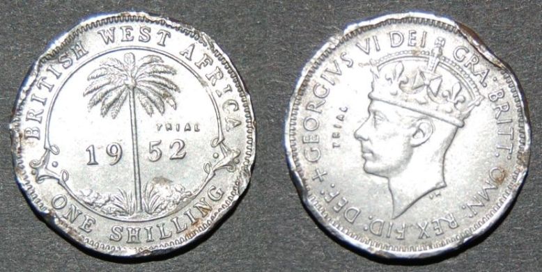 Sehr hübsche Proben. Proben interessieren mich im Allgemeinen sehr. Hier möchte ich euch eine 1-Shiling-Münze von 1952 aus British West Africa als Testmünze/Probe zeigen. Auf beiden Seiten ist das Wort "TRIAL" aufgebracht..