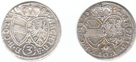 Zum füllen des Sommerlochs wieder mal "besondere" Münzen, diesmal sogar zwei. Fast jeder Sammler kommt mit ihnen irgendwann in Kontakt weil sie so häufig angeboten werden, eine der wichtigsten Münzsorten jener Zeit - der Groschen. Die Münze Hall prägte unter Leopold I. von 1667 bis incl. 1694 jedes Jahr große Mengen davon. Vom Beginn bis zur Ausgabe 1684 wurde der Herrscher mit der sogennanten "Löwenkopfschulter" dargestellt. 1684 folgte ein Motivwechsel auf "3 Ringe auf der Schulter", allerdings wurde 1684 nur ein relativ geringer Anteil mit dem neuen Motiv ausgebracht. Der größte Anteil hingegen noch mit"Löwenkopfschulter". 1685 hingegen wurde der größte Anteil bereits mit "3 Ringen" geprägt - ein kleiner Teil aber mit" Löwenkopschulter". Die geprägten Mengen wurden natürlich nicht in Motive aufgeteilt, die jeweilige Häufigkeit lässt sich nur im Rückblick durch die auf uns überkommenen Münzen schließen. Das heißt 1684 "3 Ringe" und 1685 "Löwenkopfschulter" tauchen relativ selten auf. Gleich verhält essich mit dem Motivwechsel 1692 auf die "Löwenkopfschulter" zurück. Ein kleiner Teil der ausgemünzten Menge fiel noch auf "3 Ringe". (selbst bei Coinarchives war kein einziger Groschen 1692 mit "3 Ringen" zu finden - aber jede Menge mit "Löwenkopf"). Händler & Sammler gehen in ihren Angeboten gleichermaßen nie auf diesen Unterschied ein. (Für Variantenfans gut - kosten doch die seltenen gleichviel wie die Massenausgaben) Nach endlosem stöbern & nervigem nachfragen meinerseits trödelten irgendwann doch die Varianten ein. 1690 gibt es noch zwei verschiedene Wappenvarianten (alt & neu) die aber beide gleich häufig vorkommen. So finden sich aus einer Laune heraus alle Jahrgänge incl. der Varianten von 1667 bis 1694 in meiner kleinen Sammlung. (Die Schlußmünze 1701 fehlt) Genug schwadroniert - die Bilder.